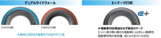 デザイン面では都市で映えるスタイリッシュなイメージを追求しつつ、タイヤの両サイドに異なるデザインを施したデュアルサイドウォールを採用。ユーザーは好みに合わせて表に見せるデザインを選択することができます。また、タイヤサイドには「M+S(マッド&スノー)」マークに加え、電動車対応商品であることを示す横浜ゴム独自のマーク「E+(イー・プラス)」が打刻されています。