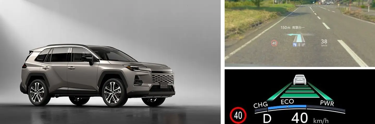 左:RAV4(プロトタイプ)/画像提供:トヨタ、右上:HUD表示イメージ、右下:HUD表示画像 ※車体の画像は2025年5月発表時点のものです。 |