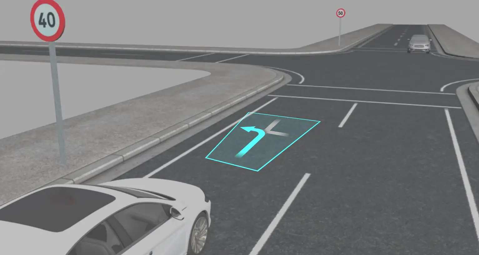 情報を傾斜面(スロープ状)に遠近距離感を持って表現することで、ドライバーにとって、従来のHUDと比較して、より直観的に認知しやすい表示を行います。当社が培った光学設計と量産技術によって実現した奥行きのある表示が、新しい運転体験を提供します。