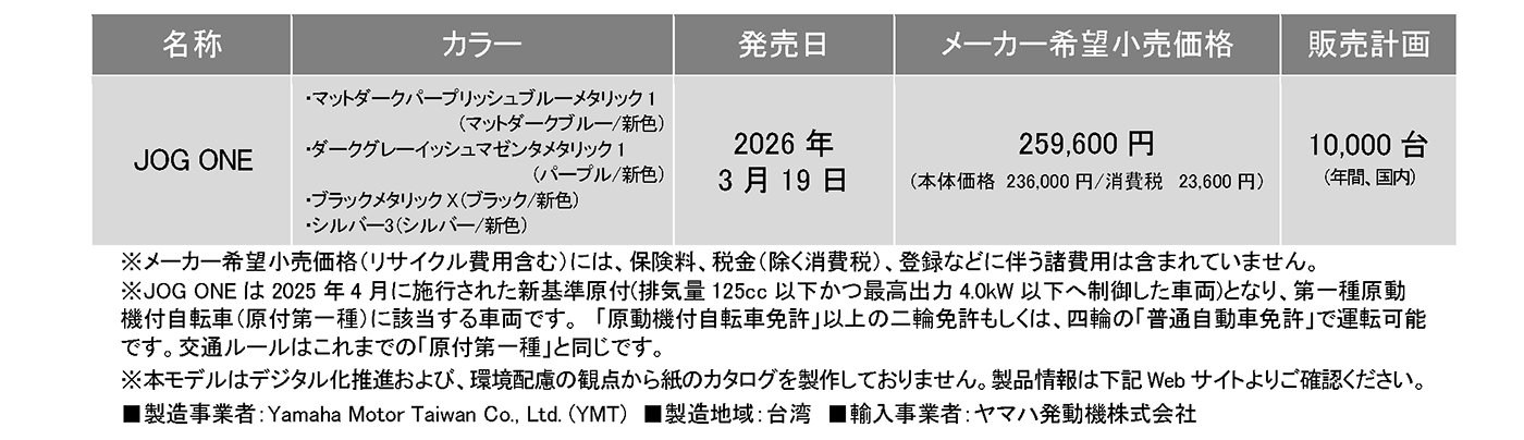 ヤマハ発動機販売株式会社は、原付一種(第一種原動機付自転車)に新たに追加された区分基準(以下、新基準原付*¹)に適合したスクーターの新製品「JOG ONE(ジョグ ワン)」を3月19日に発売します。