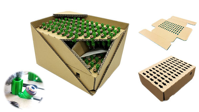 今回、インジェクターを縦向きに収容できる段ボール製の包装資材に変更したことで、収容効率向上や作業時間の削減に加え、プラスチック製包装資材の完全廃止を実現しました。