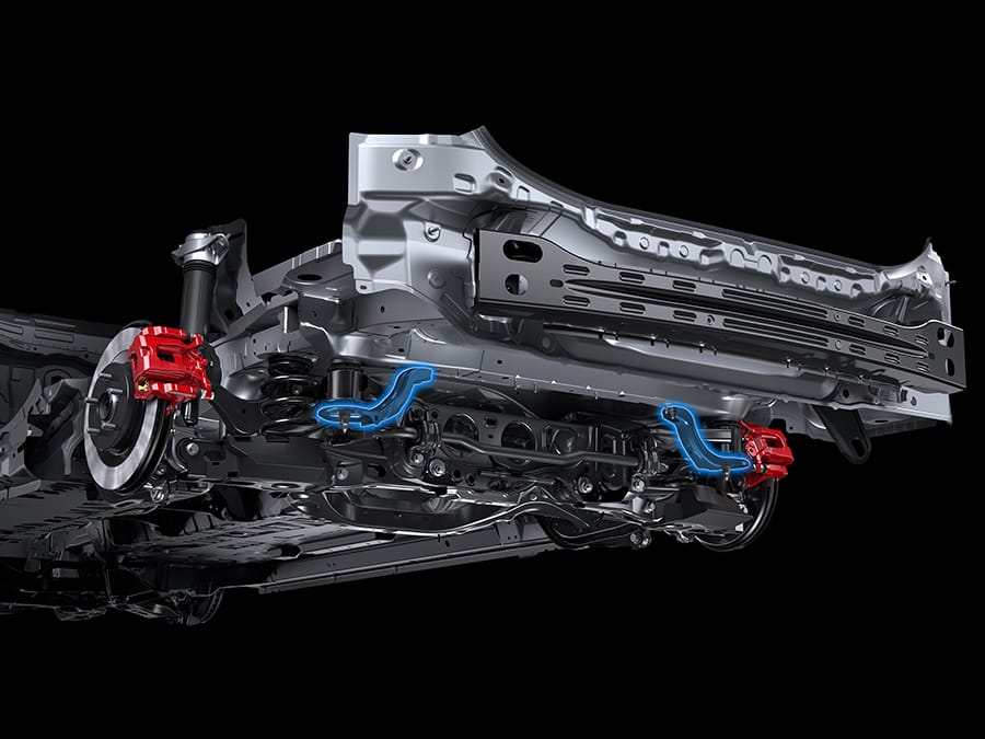 「パフォーマンスダンパー」の追加により、車体そのものに減衰特性を付与することで、走行中に生じるボディの変形を素早く収束し、車体の不快なねじれや不安定な挙動を抑えます。さらに、リヤサスペンションメンバーのブレース補強により、ダイレクトな操舵感を高めています。