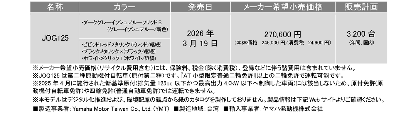 ヤマハ発動機販売株式会社は、原付二種のスタンダードモデル「JOG125」の新色を3月19日に発売します。