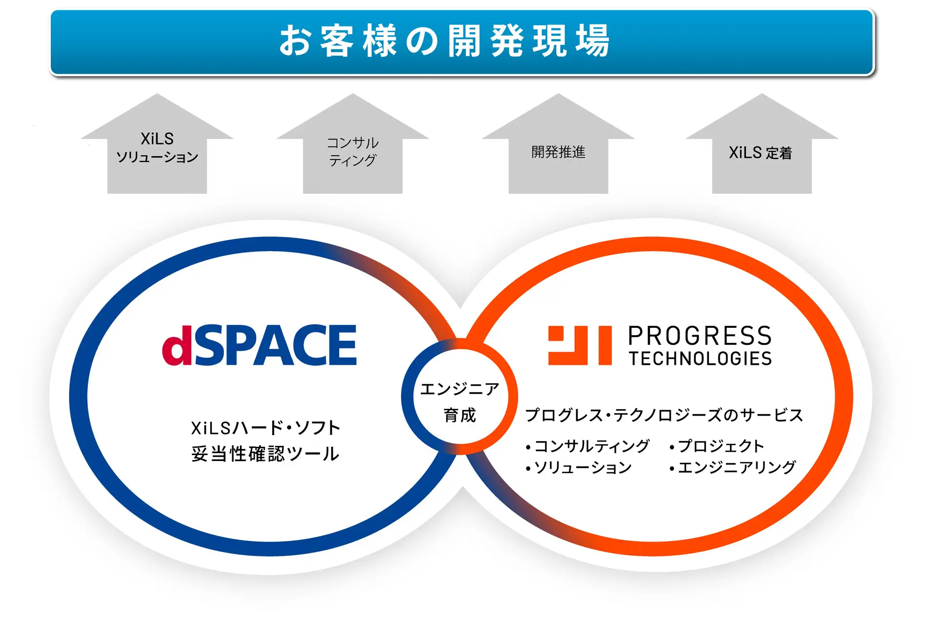 当社が創業以来、多岐にわたる開発現場で培ってきた「デジタルツールの運用経験」と「現場ニーズに関する知見」に、dSPACE Japanから提供される教育コンテンツ・サポートを融合。XiLSソリューションの提供からコンサルティング、SDVの効率的な開発推進、さらにはXiLSの定着までを一貫して支援できるエンジニアを育成するトレーニングを共同で実施しています。