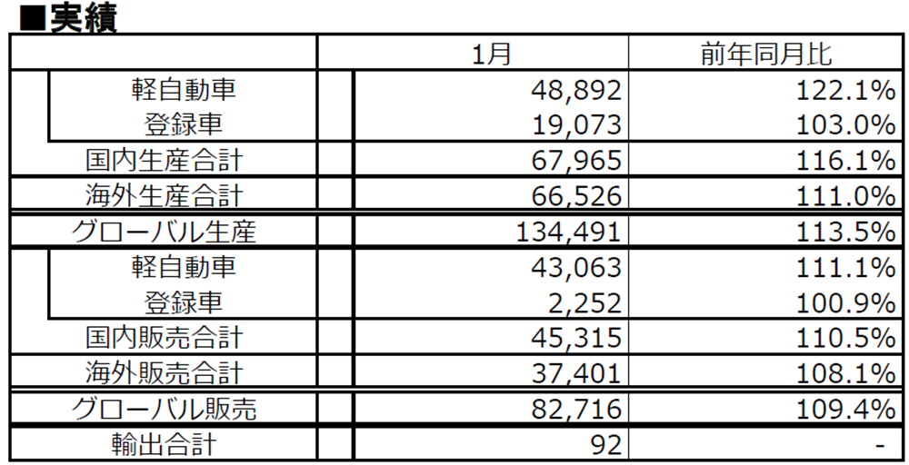 2026年1月 生産・販売・輸出実績【ダイハツ工業】