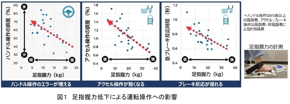今回、日産と北里大学の研究により、足指の握力はドライバーの運転操作と関連することが明らかになりました。足指の握力が低下すると、ハンドル操作のエラーが増える、アクセル操作が粗くなる、ブレーキ反応が遅れるなどの影響が見られます(図1)。こうした課題に対応するため考案したのが、「あしゆび体操」です。