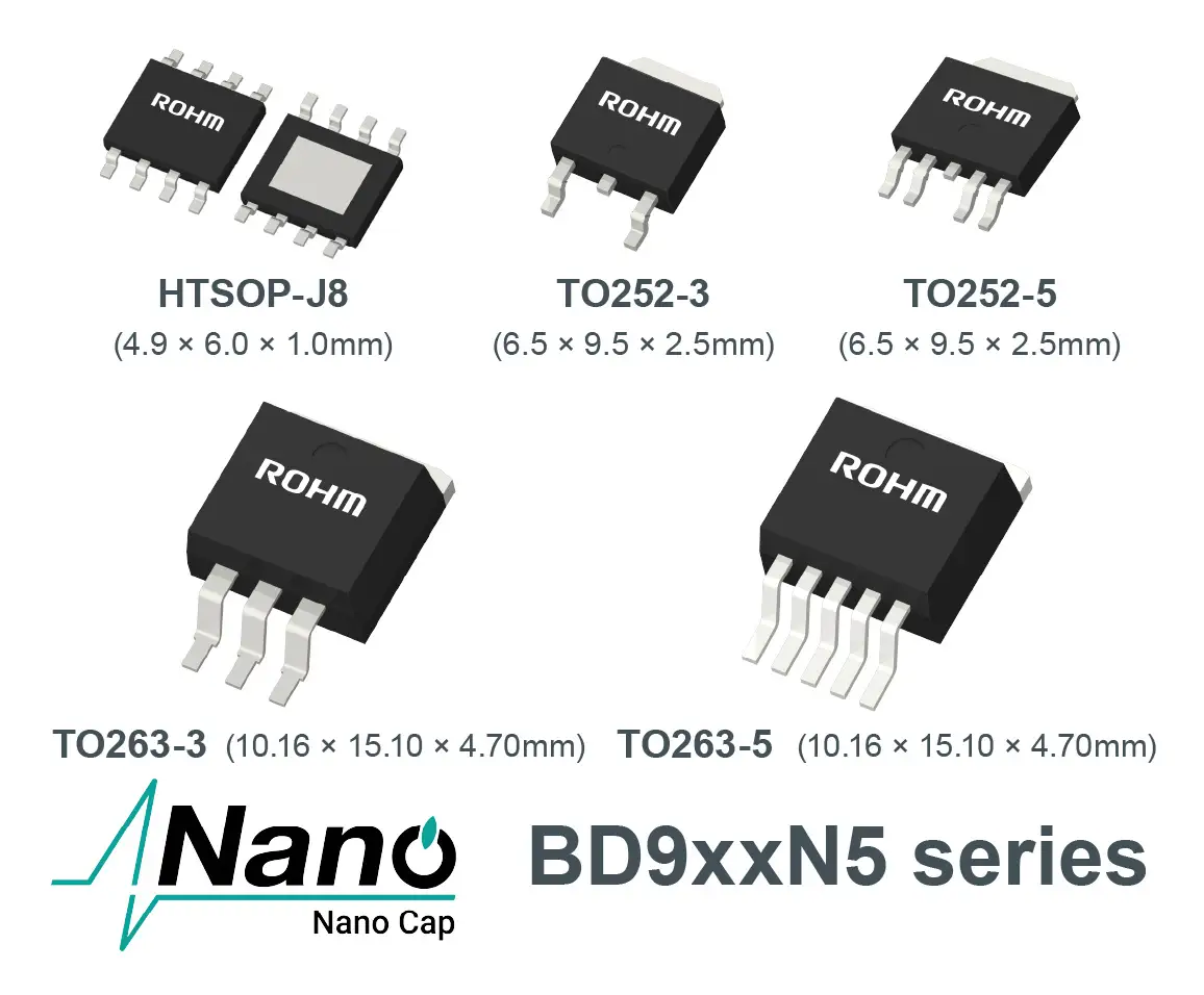 ローム株式会社(本社:京都市)は、車載機器、産業機器、通信インフラなどに用いられる12V/24V系プライマリ(※1)電源用途向けに、独自の超安定制御技術「Nano Cap™(ナノキャップ)」 を搭載した出力電流500mAのLDOレギュレータ(※2)IC「BD9xxN5シリーズ」全18製品を開発しました。