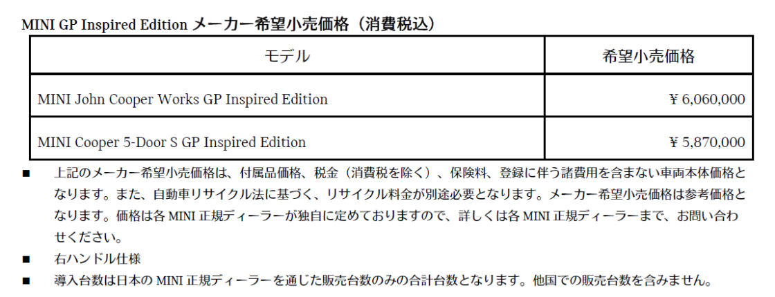 MINI COOPER 5-DOOR S GP INSPIRED EDITION: 日本全国145台限定