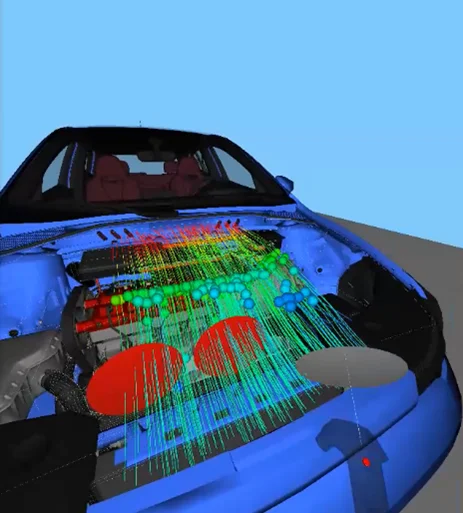 バーチャルデザインレビューの体験会を実施しています。実際にヘッドマウンドディスプレイを装着してVR空間内を自由に移動しながらCAEの可視化結果や、CADデータを確認できます。