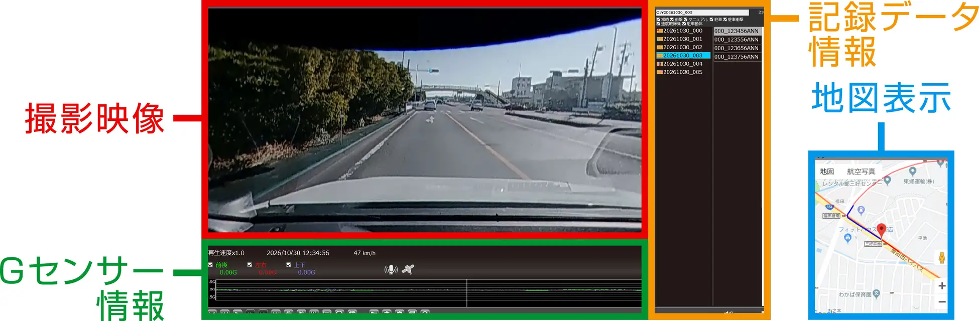 専用ビューワソフトを弊社ホームページよりダウンロードすれば、録画データをパソコンで確認できます。映像や音声だけでなくGセンサー情報も確認可能。またGPS搭載により、走行軌跡を地図上に表示したり、走行速度も確認できます。
