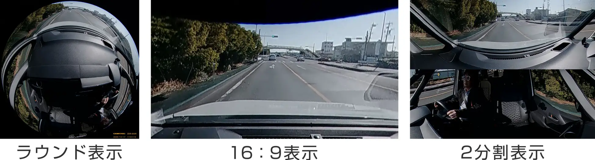 専用ビューワソフトにより、[ラウンド] [16:9] [2分割]の3パターンに表示切り替えできます。 |