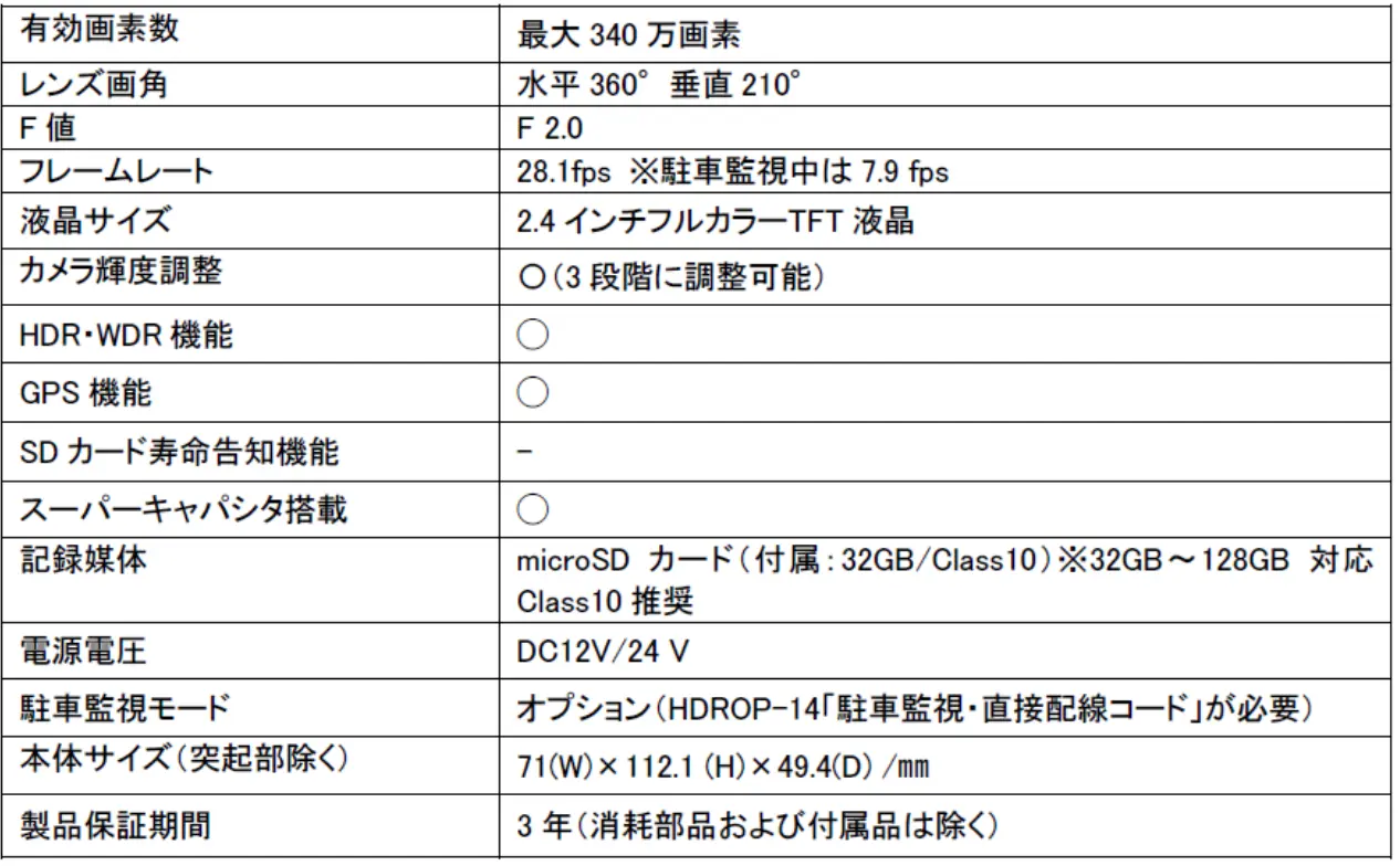 ※記録時間は付属microSDカード(32GB)で画質「低画質」/録画割合「50%」に設定した場合の時間です。ただし、車両バッテリー電圧を監視しているため、電圧が設定電圧以下に低下した場合、駐車監視モードは停止します。