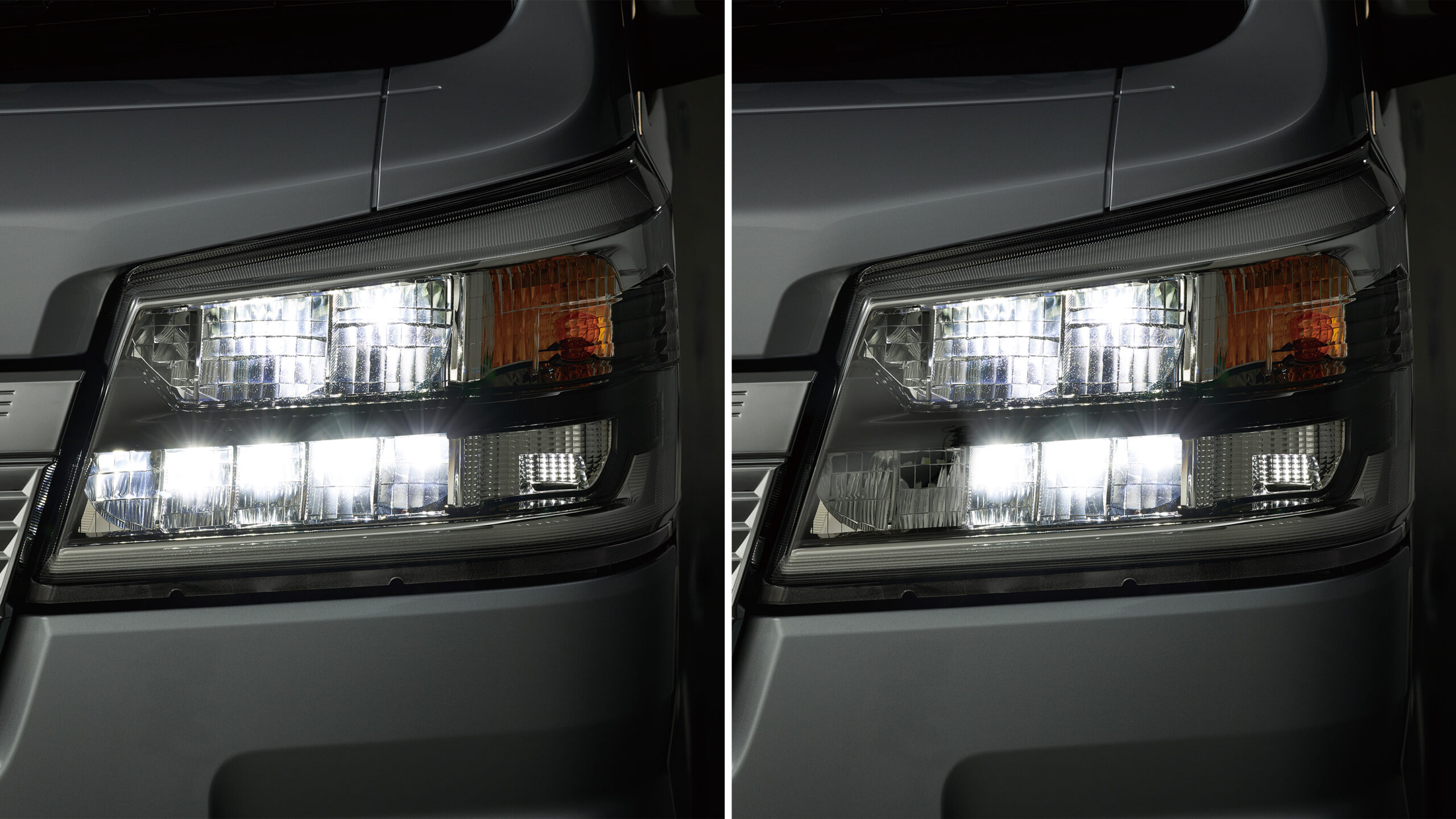 アダプティブドライビングビーム(ADB)<左 : 全点灯時/右 : 遮光時> |