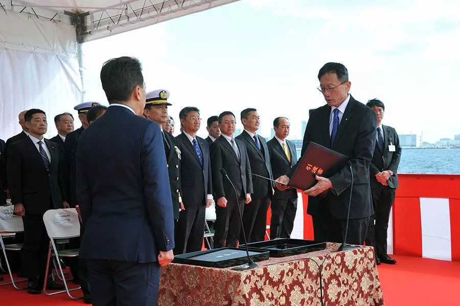式典には、宮崎 政久 防衛副大臣、國見 泰寛 海上幕僚副長、伊藤 秀人 長官官房装備官をはじめとする防衛省関係者が多数列席。当社からは、常務執行役員の江口 雅之 防衛・宇宙セグメント長らが出席しました。