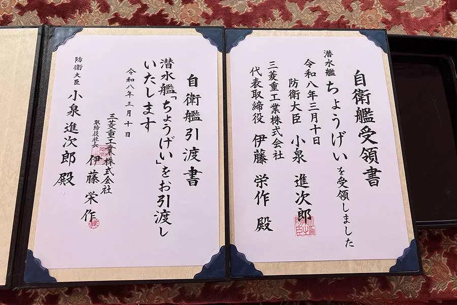 三菱重工業は10日、2021(令和3)年度に受注した防衛省向け3,000トン型潜水艦「ちょうげい」の引渡式を当社神戸造船所(神戸市兵庫区)にて実施しました。本艦は、海上自衛隊の現行潜水艦「そうりゅう」型の後継に当たる「たいげい」型の5番艦で、神戸造船所での引渡しは2024(令和6)年3月に実施した3番艦「じんげい」に続くものです。