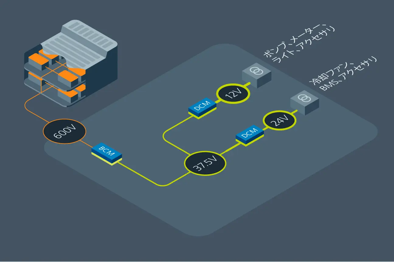 この課題を解決するためFEMは、海外の強豪チームでの採用実績も評価したうえで、Vicorのモジュールを選定しました。電源システムは、最大600Vの高電圧バッテリーからVicorの絶縁型バスコンバータBCM4414を用いて中間電圧を生成し、その出力を2つのDC-DCコンバータDCM3623で安定した24Vと12Vに変換。冷却ファンやポンプといった重要な負荷へ電力を供給する構成としました。