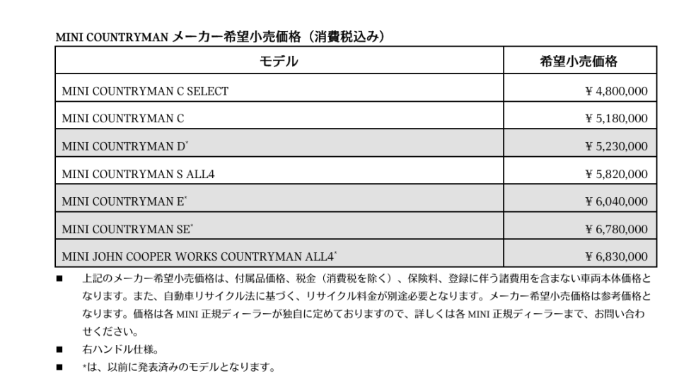 MINI COUNTRYMAN C SELECT、MINI COUNTRYMAN C、MINI COUNTRYMAN S ALL4 に