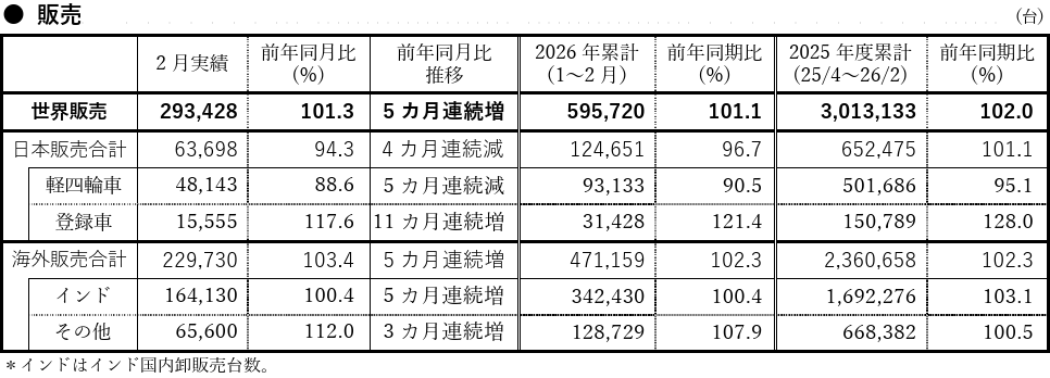 ・海外販売:2月として過去最高となったインドの増加などが牽引し、2月として過去最高となった。