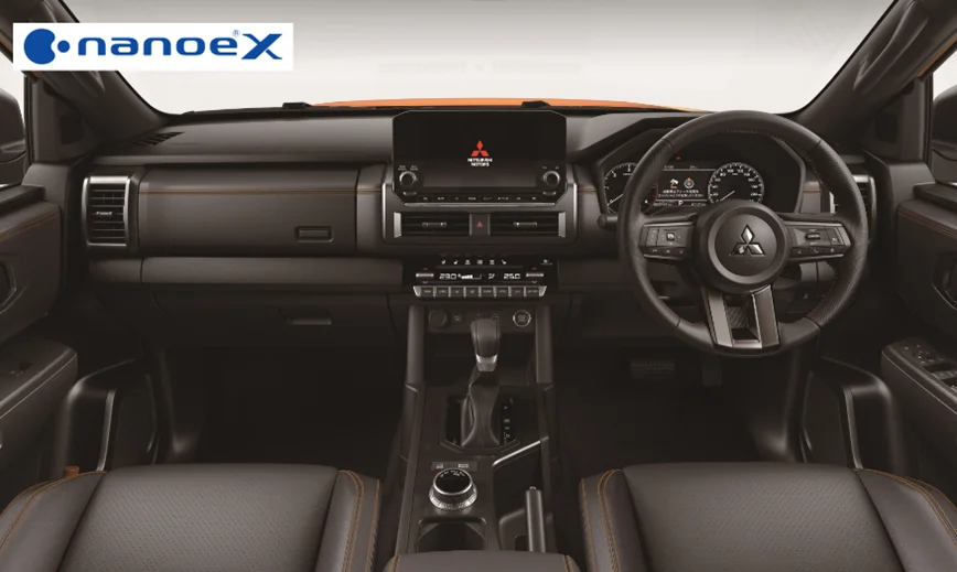 三菱自動車では、これまでパジェロスポーツやエクスフォース、デスティネーターといった海外向けモデルにナノイーXデバイスが導入されており、海外での高い評価と実績が認められ、日本向けモデルとして初の採用に至りました。かつてないタフネスと上質さを融合した「トライトン」は車室の空気質にもこだわり、外気温や車内温度に応じて、温度や風量などを自動制御するフルオートエアコンにナノイーXを搭載。エアコンから室内へ放出されるナノイーXを、リヤサーキュレーターで車内に循環させることで車内全体の空気を清潔に保ち、快適なドライブをサポートします。