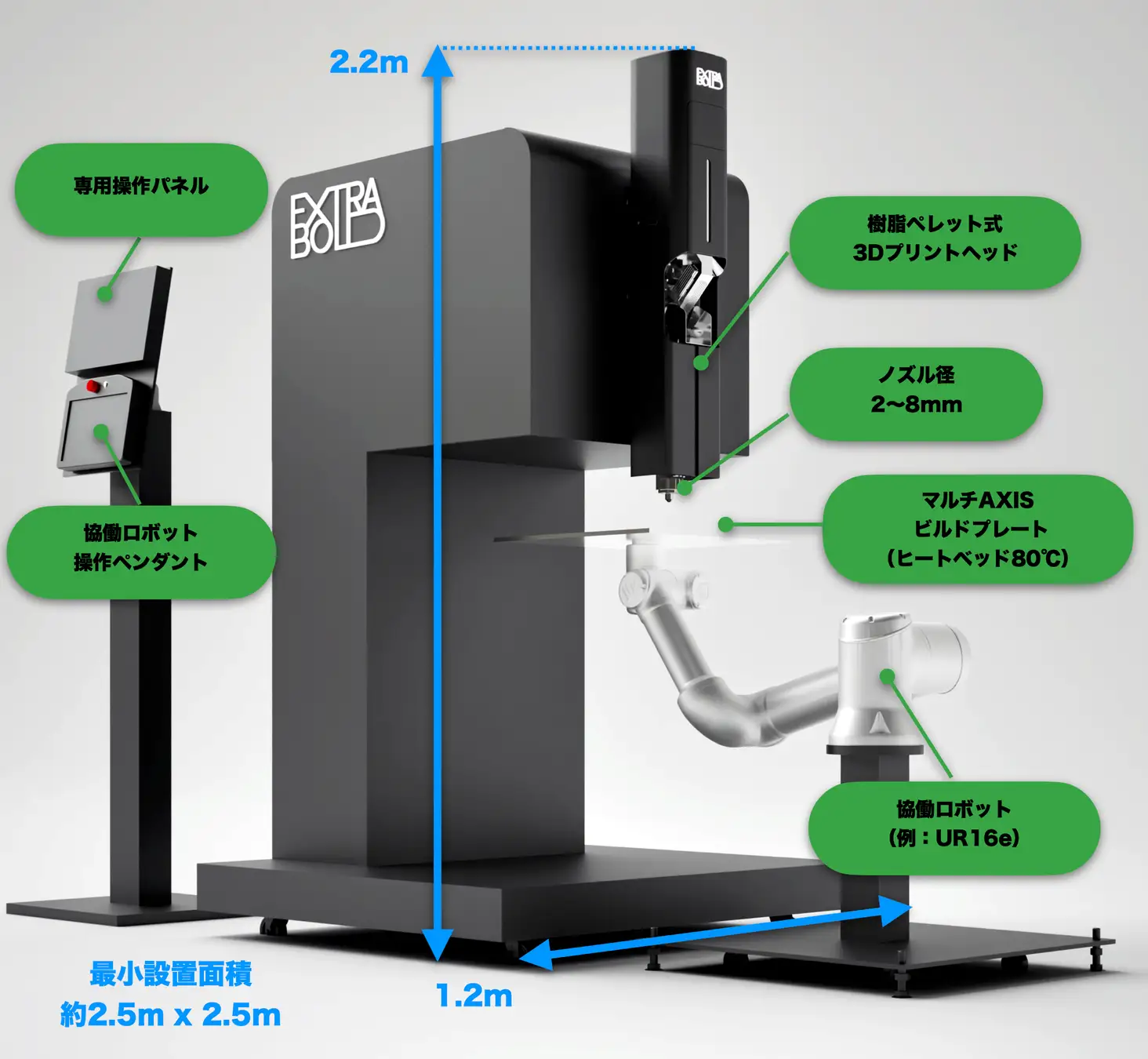 株式会社ExtraBold(本社:東京都豊島区、代表取締役:原 雄司)は、当社の協働ロボット型ペレット式3Dプリンター「