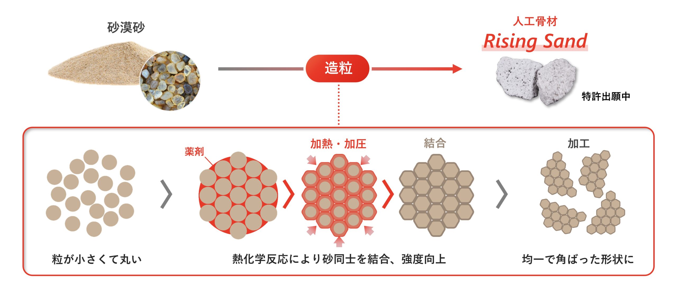Rising Sandは、100μm(マイクロメートル※3)程度の微細な球状の砂漠の砂を、特許出願中の独自の造粒技術により数十mm(ミリメートル)単位の粒径へと造粒した人工骨材です。粒度や形状のばらつきを抑えて骨材としての強度を高めることで、一般的な天然骨材を用いた道路の耐久年数が約10年とされる中、20年以上※4の耐久年数を実現しました。これにより、道路修繕の実施頻度を低減し、ライフサイクルコストを従来の約60%※4に抑えることができます。さらに、砂漠の砂や薬剤など、現地で調達できる資源を原材料とすることで、天然骨材と同等の価格での提供を目指します。世界的に深刻化している、山や河川からとれた砂や砕石などの天然資源の枯渇に対する持続可能な代替材料として、道路舗装用途にとどまらず、コンクリートや路盤材など幅広い建設分野でのニーズに応えていきます。