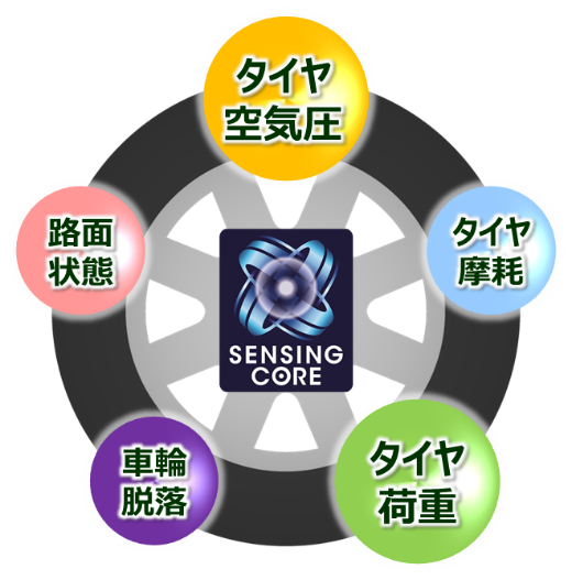 センシングコアは、タイヤの回転から得られる車輪速データと、車両に流れるCANデータ(車両制御情報)を解析することで、タイヤや車両の状態を検知する当社独自のソフトウェア技術です。タイヤの空気圧や摩耗状態、タイヤにかかる荷重、路面状態、さらには車輪脱落の予兆などを、追加のセンサーを用いることなく検知できる点を特長としています。