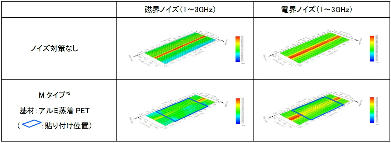 「Mタイプ」は、磁性粉分散技術とウェットコーティング技術を活かした、数百メガヘルツ~数十ギガヘルツの高周波帯域に対応した磁気ノイズ抑制薄膜フィルムです。パソコンやスマートフォンなどの電子機器や医療機器、通信機器、自動車の電子システムなどに使用されるケーブル、IC、回路基板、コネクタなどのノイズ発生源周辺で生じるノイズの抑制に貢献します。
