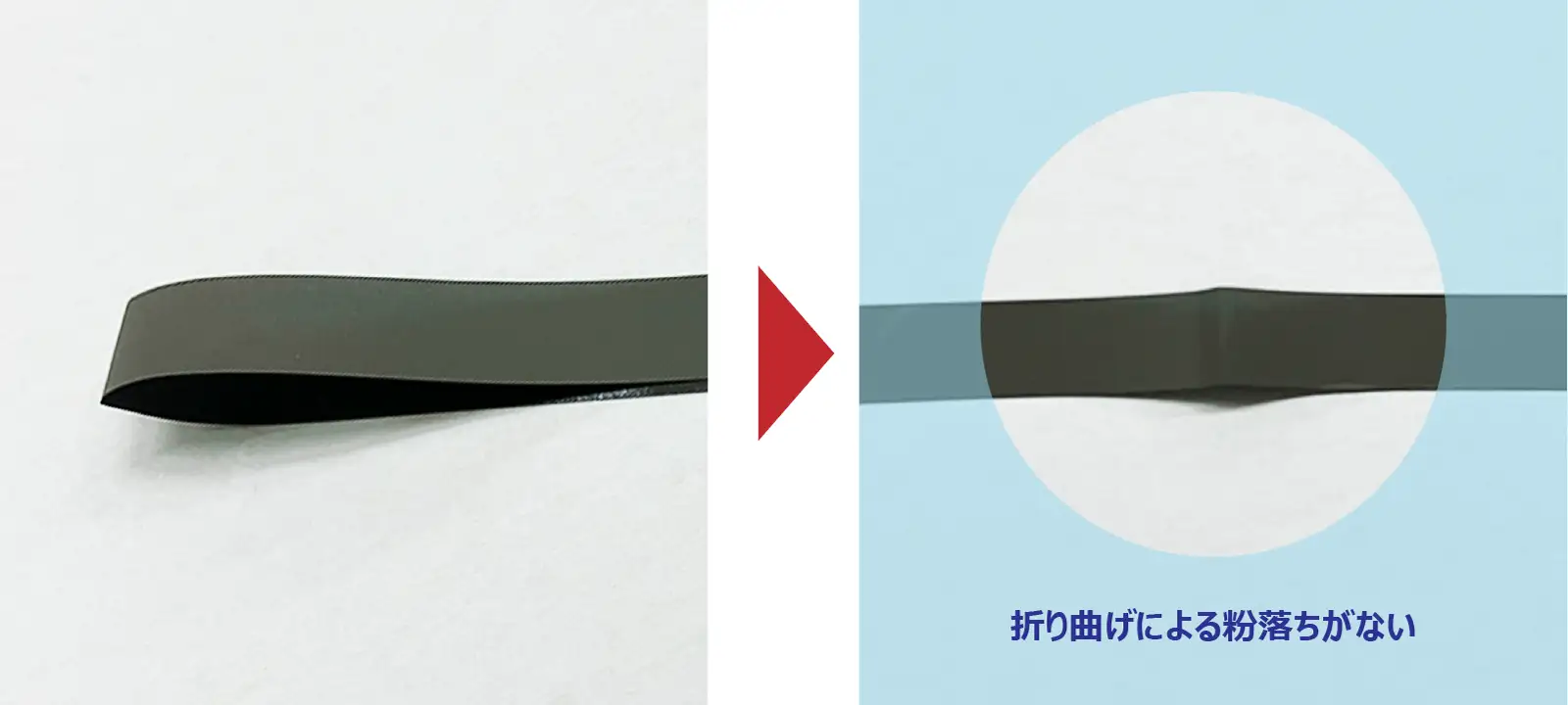 写真は「KM」品における折り曲げ例(厚さ約60マイクロメートルの薄さで直径1ミリメートルの曲げ)