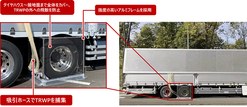 大型タイヤにも対応可能な吸引装置および吸引口を開発。風の影響を受けやすいカバー部分には強度の高いアルミフレームを採用。この捕集装置を活用し、走行時に発生するTRWPを捕集します。