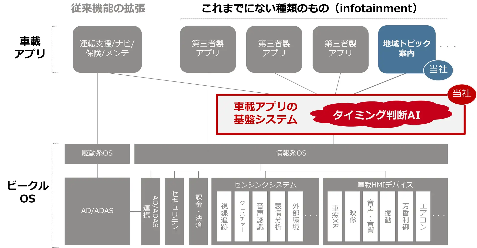当社の独自AI「タイミング判断機能」は、2030年代前半には20~30兆円規模となる車載アプリ市場にて、多くのアプリに用いられる基盤システムになります。それぞれの車載アプリには様々なコンテンツが含まれるなかで、それらのコンテンツを発信するタイミングを判断する役割を担います。