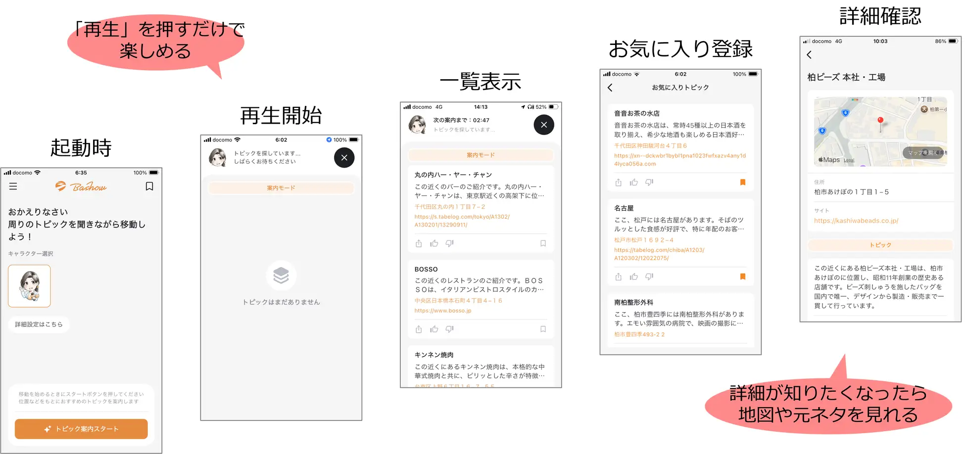当社のスマホアプリ(アプリ名「Bashow」、iOSおよびAndroid)は、クルマなどで移動中の人に、その場所周辺のトピックを、数分に一回、短い音声で案内するものです。トピックとは例えば「そこの○○カフェでは○○がおいしい」「この近くの○○神社は……という歴史がある」などちょっとした小話です。当社のシステムが公開情報をもとに繰り返し膨大なトピックを創出しており、都市部では1km2あたり100個以上のトピックがあります。