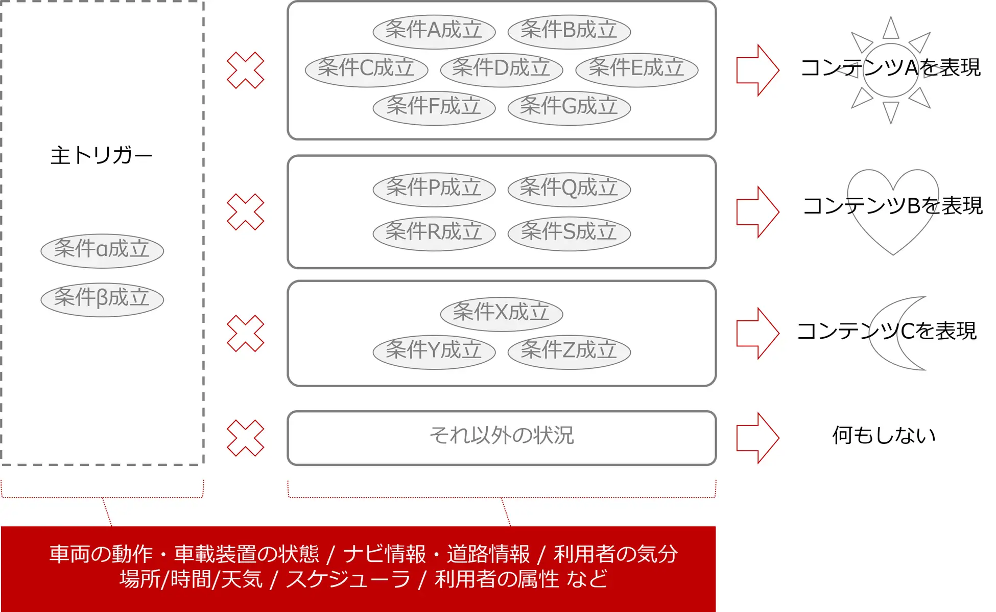 このような車載アプリのコンテンツは、刻一刻と環境や状況が変わる走行中の自動車にて、タイミングよく発信することが必要です。車両の動作、車載装置の状態、ナビ情報、道路情報、利用者の気分や雰囲気、場所、時間、天気などを踏まえて適切なコンテンツをリアルタイムに選定あるいは創出することが求められます。