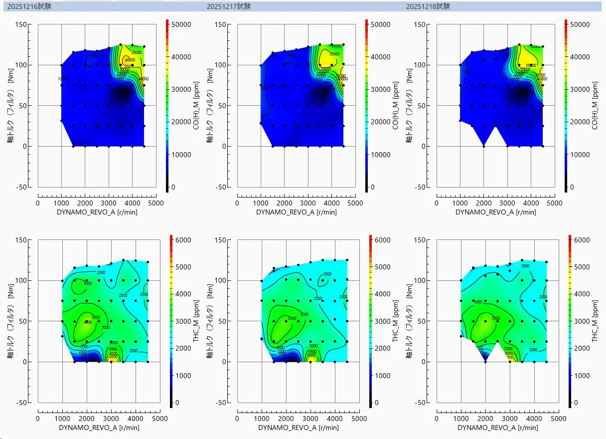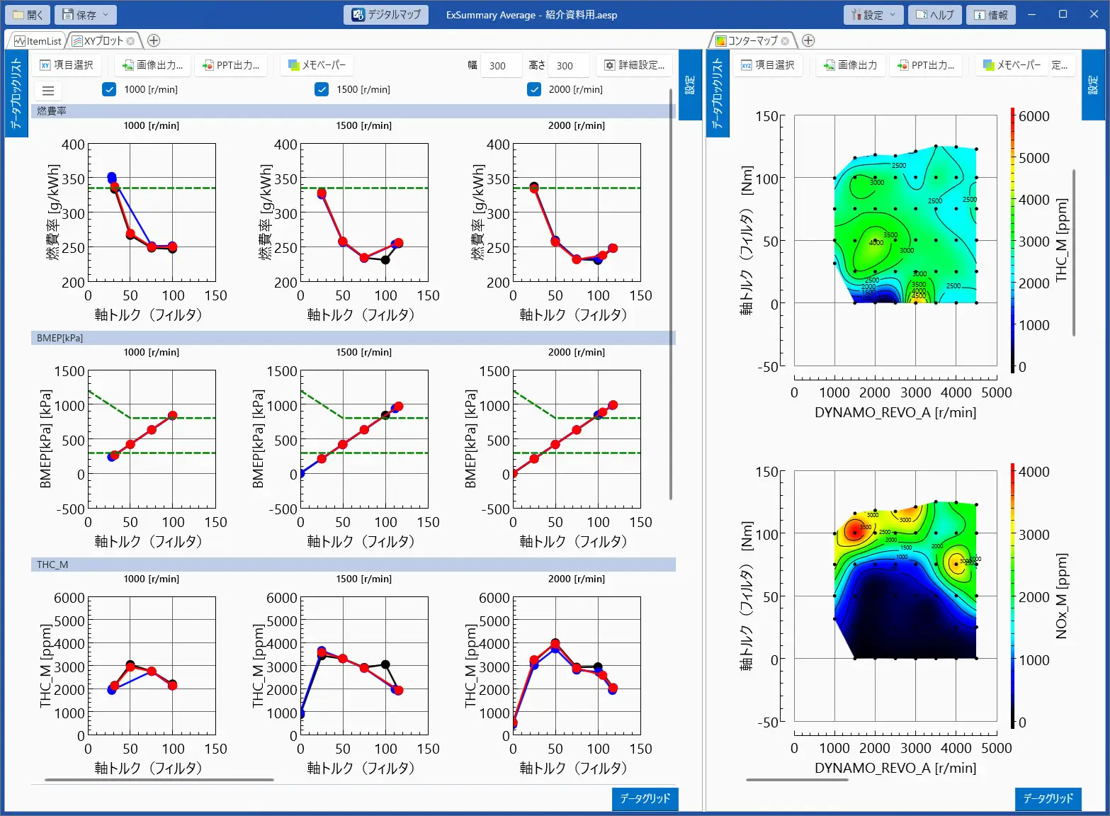 XYプロットは、試験の目的に合わせてデータを自動で仕分けし、散布図として表示する機能を搭載しています。コンターマップおよびデジタルマップは、インポートした3次元データが格子状にない場合でも補間処理を行うことで、等高線や数値による補間結果を確認できます。