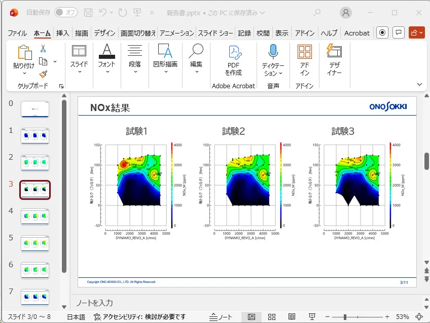 作成したグラフは画像として出力できるほか、PowerPoint形式で保存可能。お客様指定のテンプレートを使用すれば、そのまま報告書として活用できます。