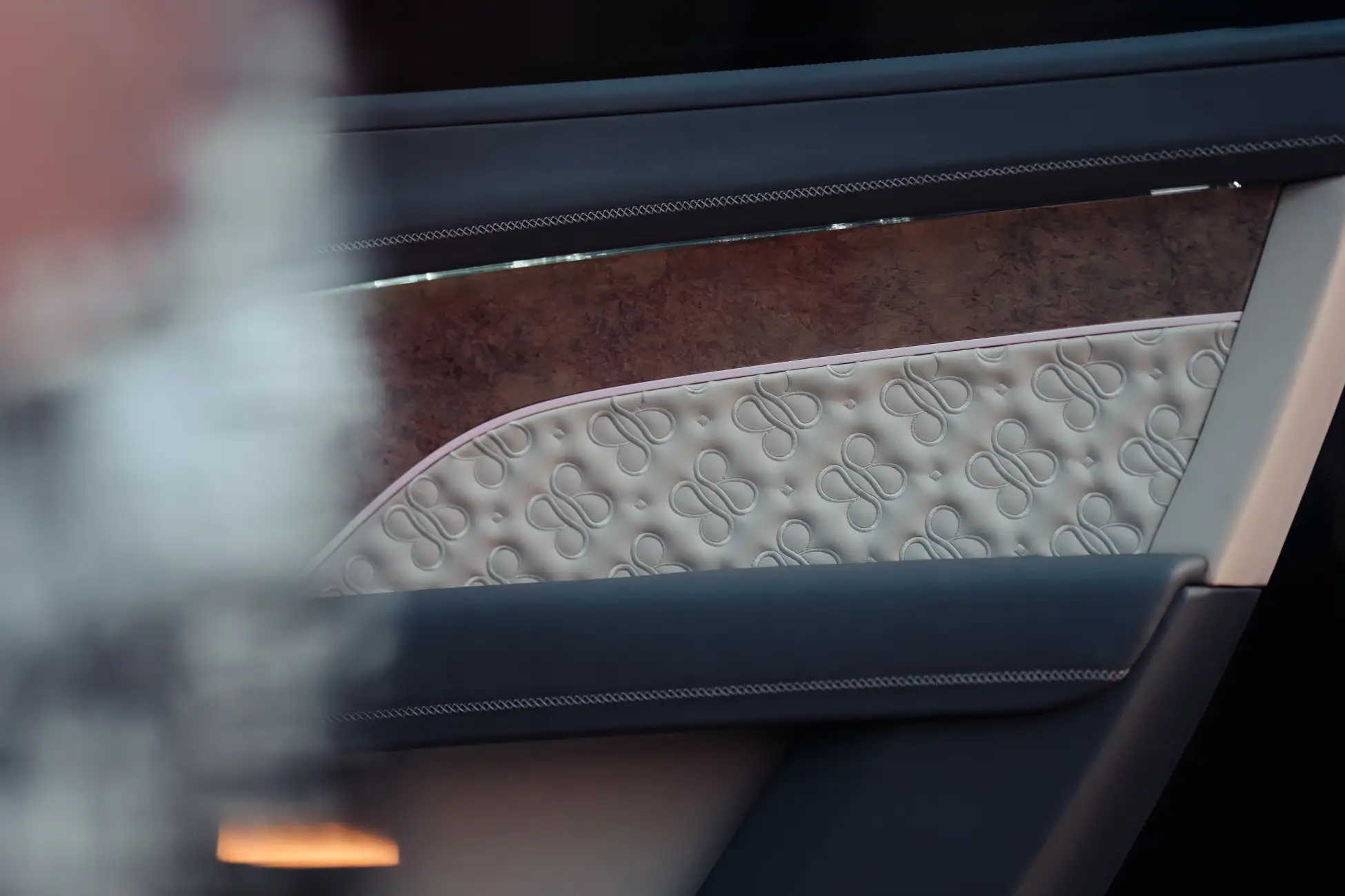 インテリアには、Gravity GreyとLinenのレザー、Autumn StoneおよびPiano Linenのヴェニアを採用し、繊細なダイヤモンドディテールやムードライティングが上質な空間を演出します。センターコンソールには、ダイヤモンドをあしらった特別仕様の「Be Boodles」デザインが施されています。
