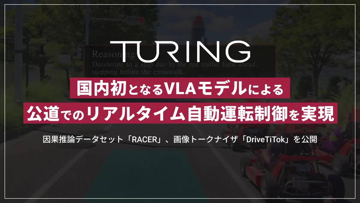 Turing株式会社(東京都大田区、代表取締役:山本 一成、以下「チューリング」)は、自動運転向けフィジカルAIであるVLA(Vision-Language-Action)モデルにおいて、国内で初めて(※1)公道でのリアルタイム制御および走行を実現したことをお知らせします。あわせて、因果推論データセット「RACER」および画像トークナイザ「DriveTiTok」を公開しました。