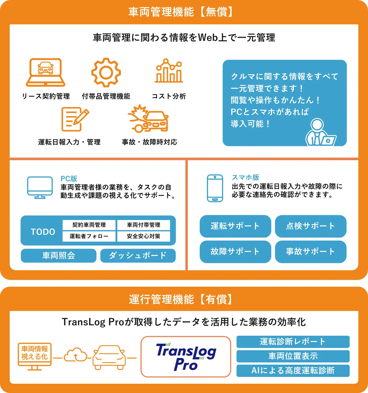 近年、企業の車両管理者の業務は大きな負荷となっています。「TransLog Pro」は、AI+クラウド管理で、車両管理業務の効率化をサポートいたします。