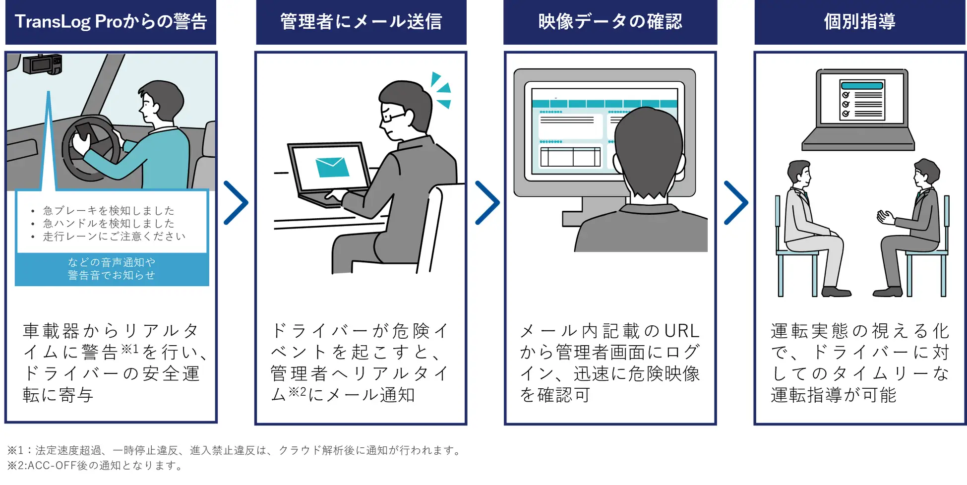 さらに、管理者へも通知をすることで、「タイムリー」な運転指導が可能