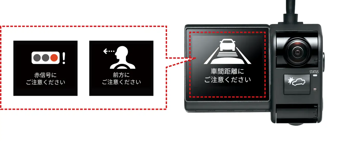 危険な車間距離や急アクセルなどを検知すると、ディスプレイに表示。音声でも警告します。車載器の状態も表示し、各種設定も車載器単体でできるよう、操作性が向上しました。