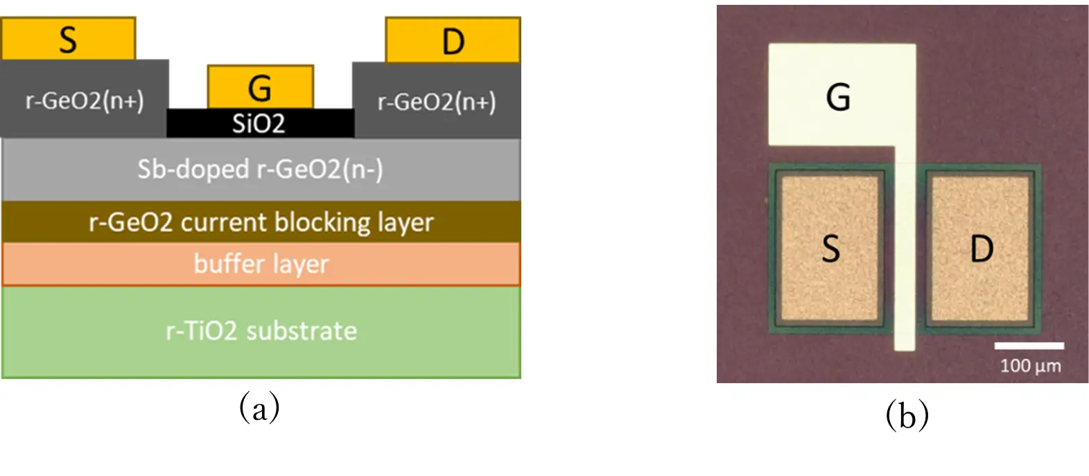 図1:r-GeO₂ MOSFETの(a)断面模式図と(b)光学顕微鏡像 |