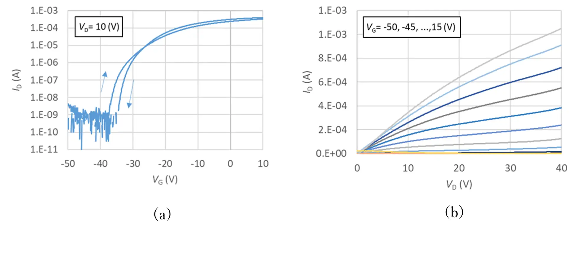 また、図2(b)に示すID-VD特性からは、ドレイン電圧Vdの増加に伴い、線形から飽和特性へと移行する典型的な特性が確認されました。