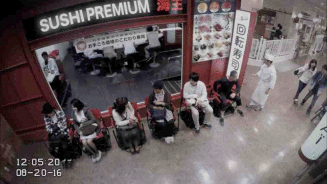 このイスに座ると、お寿司屋さんの前の行列でも、ストレスなく待つことができます。